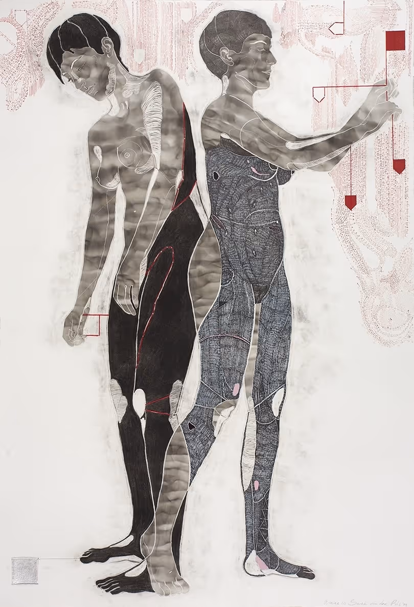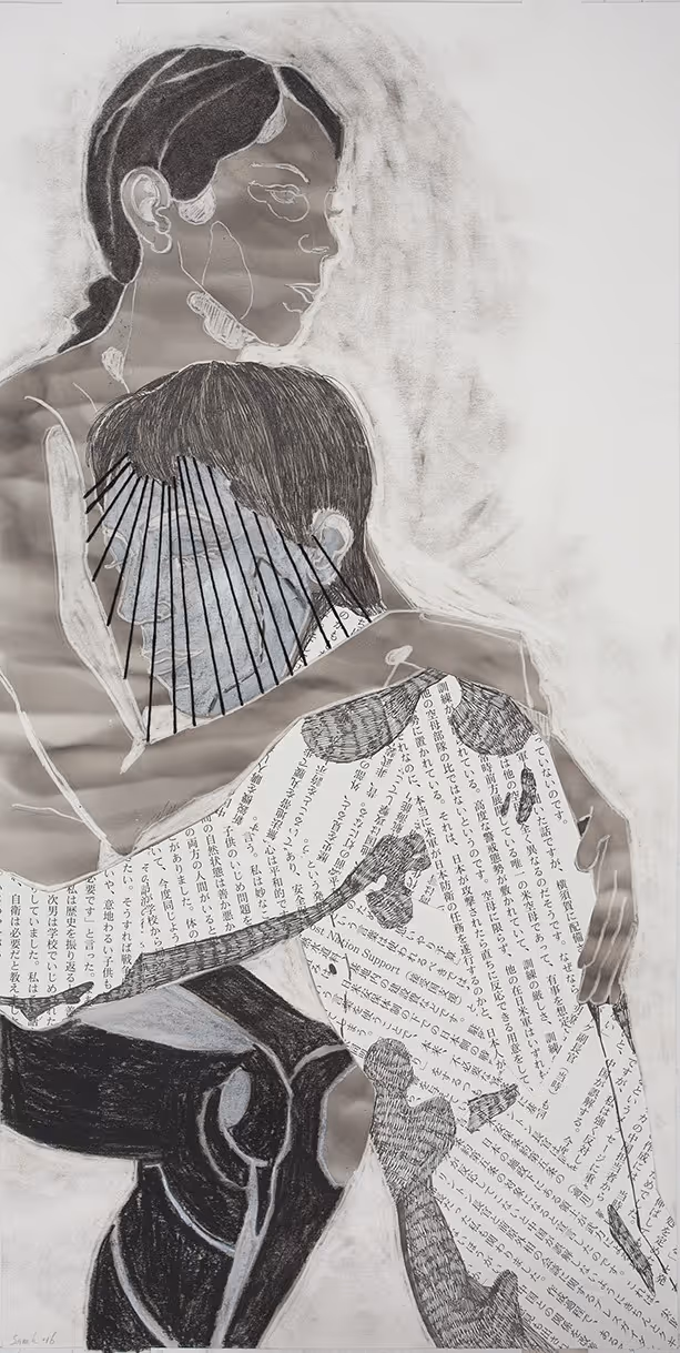 soot, pigment ink, pigment marker, pastel and silk on paper